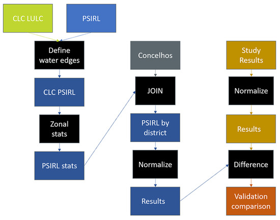 The validation process is depicted in Figure 3. The original PSIRL index is translated to land use codes used by the CLC LULC (see Appendix A), The “unclassified” features representing water areas are selected then intersected to create water edge lines. These are buffered by 10 m and merged with the LULC polygons. These are then converted back to rasters and zonal statistics are applied. These are joined to the CAOP municipal boundaries, normalized, and then compared to the normalized index values of the results.