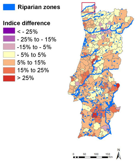 Difference between study results and Pollination Suitability Index for Riverine Landscapes (PSIRL) with riparian zone overlay. Red box indicates River Minho area, in north western Portugal.