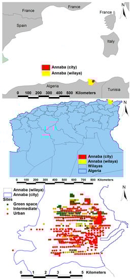 The study was carried out in and around the City of Annaba from the Wilaya of Annaba in Algeria. Figure 1 shows the study location in an international and national context, and also the location of sampling points.