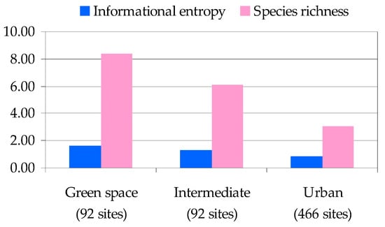 The results of the analysis of variance (ANOVA) indicate that there are statistically significant differences between the three types of sites (“green space”, “intermediate”, and “urban”) with respect to species richness (F = 440.77, p < 0.0001) and Shannon-Wiener’s informational entropy index (F = 177.17, p < 0.0001). The results were confirmed by all three post-hoc tests, which found significant differences between the values of the two indicators among each possible pairs of sites. Figure 2 presents the average values of the two indices, indicating that the underlying hypothesis of the study is verified by the statistical analysis.
