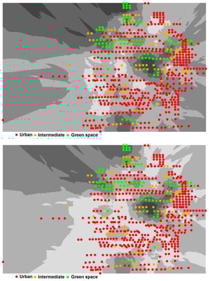 The geospatial analyses examined the spatial distribution of biodiversity, assessed using the species richness and Shannon-Wiener’s informational entropy index, against land cover and use. For this purpose, ArcGIS10.X (Redlands, CA, USA) was used for the spatial interpolation of the two biodiversity values via simple kriging [71], preferred due to its intuitiveness and broad use. The land cover surfaces were also derived by interpolation based on assigning proximities with the Spatial Analyst extension of ArcView GIS 3.X (Redlands, CA, USA).