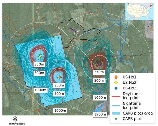 A composite footprint map was made by overlapping layers in Figure 1. The bottom layer consists of a satellite image showing the complete Howland research area redrawn from https://umaine.edu/howlandforest/about/. Then, the CARB measurements area with its plots were redrawn from [17] and overlapped. The top layers are the footprint monthly climatology maps that are in the dataset S3 downloaded from https://zenodo.org/record/4015350 with their backgrounds removed and centered at each tower location. All the Howland footprints available were used (2013 to 2017 for Ho1, and 2003 to 2008 for Ho2 and Ho3). Tower locations and reference circles were highlighted for comparison.