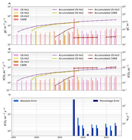 Yearly net ecosystem exchange (NEE) budgets (bars) and accumulated values (lines) for US-Ho1 (purple), US-Ho2 (green), US-Ho3 (brown) towers and for CARB (red) data in log-scale and in (A) grams of carbon per square meter and (B) tons of CO2 per acre. (C) Absolute and percentage CARB yearly errors based on direct measurements from US-Ho1, in log-scale. Negative error values were made positive to include them in the log scale. A table of errors is provided in the Supplement Table S6.