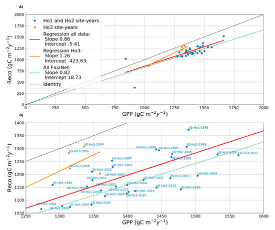 Yearly Reco vs. gross primary productivity (GPP) for US-Ho1, US-Ho2 (blue points) and US-Ho3 (orange points). The regression lines (using all the data, solid red line; using only US-Ho3 data, solid orange line). The identity (dashed black line) and FLUXNET regression (dashed green line) were added as a reference. (A) All the years; (B) only years in the ranges (1050; 1400) and (1250; 1600) gC m−2 y−1 for Reco and GPP, respectively.