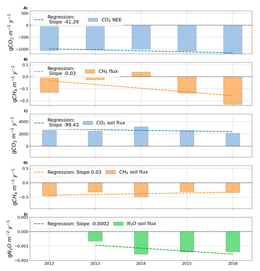 Yearly budgets (bars) and trends (lines) for CO2 (A) and CH4 (B) fluxes measured at the top of the tower, and soil CO2 (C), CH4 (D) and N2O (E) fluxes measured at chambers no. 2 (CO2 and CH4) and no. 10 (N2O). Soil fluxes budgets from (C–E) correspond only to the period May–November, while the tower fluxes from (A,B) to the full year [38].