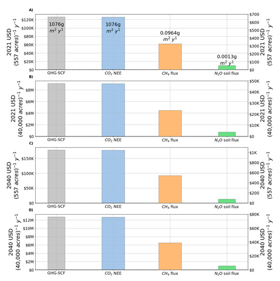 Greenhouse gas (GHG) social cost forest (GHG-SCF) yearly means (bars) for CO2 (blue) and CH4 (orange) fluxes measured at the top of the tower, N2O (green) fluxes measured at chambers no. 2 (CO2 and CH4) and no. 10 (N2O), and the total sum of the three (GWG economic value; gray). Soil flux averages correspond only to the period May–November, while the tower means to the full year. For illustration purposes, results were extrapolated to the Howland research area (557 acres; panels (A,C) and to 40,000 acres (panels (B,D). Social cost values (USD) used were (A,B) $52, $1500, and $19,000 per GHG metric ton of CO2, CH4, and N2O, respectively (values estimated for the year 2021). (C,D) $73, $2500, and $28,000 per GHG metric ton of CO2, CH4, and N2O, respectively (values estimated for the year 2040) [33]. In each panel, GHG-SCF Economic values and CO2 NEE are represented by left Y-axes, while CH4 and N2O fluxes by right Y-axes. In panel (A), yearly means capture is annotated for each gas in g m−2 y−1 above each bar.