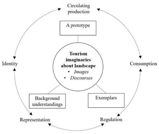 We combined the ideas of Taylor, Strauss, and Salazar [24,26,31], and Figure 1 shows the conceptual framework used in this study for tourism imaginaries about landscape. Because of the intangible nature of tourism imaginaries, “the only way to study them is by focusing on the multiple conduits through which they pass and become visible in the form of images and discourses” [26]. These social imaginaries can be viewed as including three types of knowledge: a prototype, exemplars, and background understandings [39]. A prototype is a real or constructed good example of a category [46]. Exemplars are specific examples. Background understandings include other information that is part of the concept, such as how and why features of the prototype are present, how they are related, and when variations of the prototype would be expected. As long as tourism imaginaries about landscape are recognized, it is important to realize that they are dynamic rather than fixed. The movement process of tourism imaginaries can be framed by “the circuit of culture” model [47], which places imaginaries in the circulation of culture. According to Du Gay et al., five moments can be identified in the circuit of tourism imaginaries: representation, circulating production, consumption, regulation, and identity. The imaginaries circulate unevenly and non-linearly [26], and the movement is embedded in the social practice of tourism stakeholders. Power relations influence this process, strengthening or restricting certain imaginaries.
