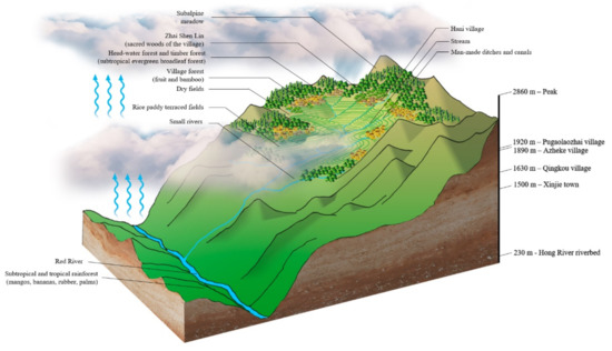 The Hani moved to Ailao Mountain 1300 years ago and began to construct terraced fields and plant rice on the mountain slopes of the Red River Valley. As a result of inconvenient transportation and little communication with the outside world, the Hani people living in mountainous areas have developed and maintained unique agricultural traditions and lifestyles. The Hani’s agricultural planting is dominated by red rice, and the terraces are mostly cultivated on slopes of 900–2000 m. There is abundant rainfall due to water vapor from the Red River Valley, and the annual precipitation is more than 1400 mm. Because the climate on the hillside is colder than the Red River Valley, water vapor often forms a lot of clouds at this altitude. The Hani people use the abundant precipitation to build layers of paddy fields with rocks and soil along the hillside contours. Additionally, they built a sophisticated irrigation system to distribute water between plots. Most of the Hani’s villages are located on the upper edge of terraces between 1400 and 2000 m. Above the village is the forest (Figure 2).