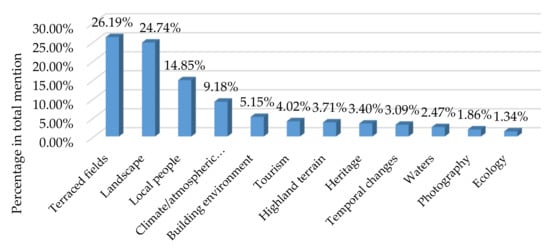 The content analysis of tourists’ comments identified 12 themes from the mentioned words, reflecting different aspects of tourist discourses relating to the Honghe landscape. Words related to the tourist experience were mentioned 970 times in 75 comments (Table 1). The percentage of each theme shows how frequently the landscape is imagined as a particular representation (Figure 4).