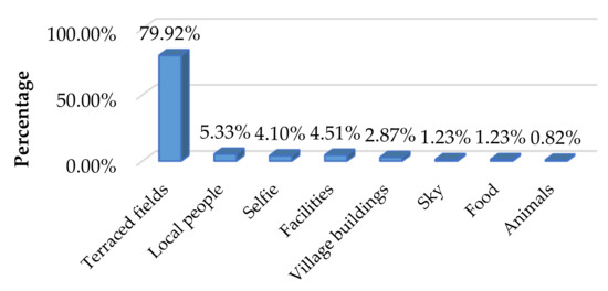 Figure 5 shows the themes and proportion of the tourist photos. The vast majority of captured landscapes are terraced fields, accounting for 79.92% of all photos. Other inherent elements of the Hani landscape, including local people and village buildings, have attracted less attention from tourists. This again supports the findings from the discourse analysis: there is a gap between the tourism imaginary of the place and the actual Hani landscape, and the imaginary primarily contributes to the tourist experience.