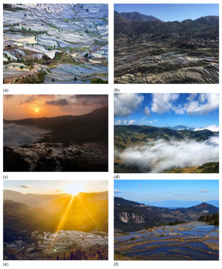 For tourists, the terraces are the center of the tourism imaginary of the landscape, and the place is imagined as a stereotyped overlooking scene of terraces, a schema, separated and independent from other components of the Hani landscape. Table 2 shows patterns of image formations in tourist photos related to terraced fields. We identified seven image compositions. Among the photos, more than half used the entire picture to show the layered pattern of the terraces (32.31%) or the panorama taken from the viewing deck (23.08%) (Figure 6a,b). “Sunrise” (14.87%), “terraced fields amid fog/sea of clouds” (11.28%), “sunset” (10.26%), and “blue terraces” (4.62%) were also frequently used patterns by tourists who took photos of terraced fields (Figure 6c–f).