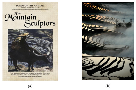 The mountain sculptors: (a) cover of the photo album; (b) a photo of Hani terraces by Yann Layma.
