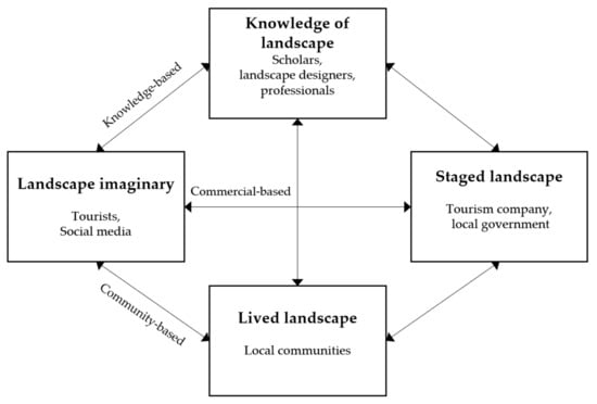 According to Lefebvre [61] (p. 33), the social space is produced within the interactions among spatial practice, representations of space and representational space. In this regard, the production of landscape space in tourism can be conceptualized as the result of interactions of “staged landscape”, “knowledge of landscape”, and “lived landscape” (Figure 8). The staged landscape represents the landscape experienced by tourists and is the landscape staged for gazing by the tourism industry for commercial goals. Knowledge of landscape is the concepts of landscape, constructed by experts such as scholars, landscape architects, and professionals. Lived landscape is the landscape created by residents or users in their daily activities, in this case, the Hani landscape as cultural heritage. The “landscape imaginary” of tourists is generated from the three elements, including commercial-based, knowledge-based, or community-based imaginaries.