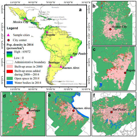 We collected urban land use maps of five Latin American cities in 2000 and 2014 from The Atlas of Urban Expansion (2016 Edition), which were interpreted using Landsat imagery (30 m resolution) []. They classified land use into three categories, namely, built-up area, open space, and water bodies, using the unsupervised classification method (clustering analysis) with the ISODATA (Iterative Self-Organizing Data Analysis Technique) algorithm. The classification result has a high accuracy with verification using Google Earth high resolution imagery. The user’s accuracy for the built-up area is 91% and the producer’s accuracy is 89.3% []. Detailed information on the land use classification procedures can be found in Hurd []. The data from The Atlas of Urban Expansion (2016 Edition) has been successfully used in related studies on urban expansion and urban form [,,]. The spatial distributions of urban land in 2000 and 2014 and open space and water bodies in 2014 of five Latin American cities are shown in Figure 1.