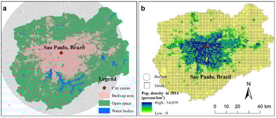An example of concentric ring analysis (a) and grid-based analysis (b) in São Paulo, Brazil.