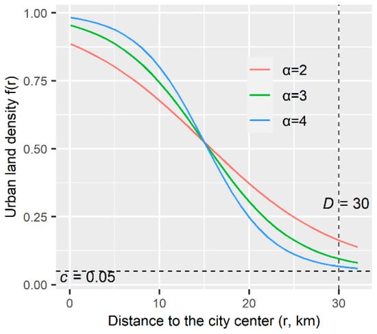 Parameters in the inverse S curve have explicit physical meanings. The α parameter controls the form of the fitting curve and a higher α indicates a more compact urban form (Figure 3). The D parameter denotes the approximate boundary of an urban extent. The c parameter represents the background value of the urban land density. The D parameter generally increases over time because the urban extent expands. Detailed explanations of these three parameters can be found in Jiao (2015) [].