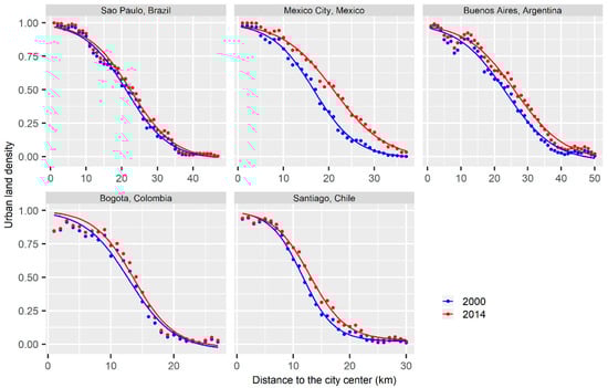In the global context, the speed of urban land expansion in Latin American cities is relatively low. The intensity of the urban expansion is reflected by the gaps between the two fitting curves using the inverse S curve. The gaps between the two curves in 2000 and 2014 are very close and even overlapped in the five major Latin American cities (Figure 4). Not to mention the fast urban expansion in China and other countries in Asia and Africa, even the expansion of urban land in the United States and Europe is greater than in Latin America [,,,]. On the other hand, the urban form of Latin American cities is more compact than for cities in other regions, which is quantified by the α parameter of the inverse S curve. The α parameter for the five major Latin American cities varies in 3.39–4.49, while that for Chinese and European cities is around 2.5, and is less than 2 for cities in the United States for the same two years (2000 and 2014) [,,]. Many Latin American cities grow in rugged topographies which constrains expansion, resulting in the overall compact urban form [].