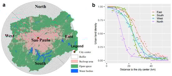 The concentric ring in four directions (a) and the spatial attenuation of urban land density in four directions of São Paulo in 2014 (b).
