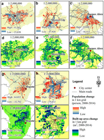 Spatial distributions of population changes (a–c,g,h) and built-up area changes (d–f,i,j) from 2000 to 2014 in five Latin American cities. Only three types of roads (trunk, primary, motorway) were preserved from the OSM road net (https://www.openstreetmap.org) (accessed on 20 April 2021).