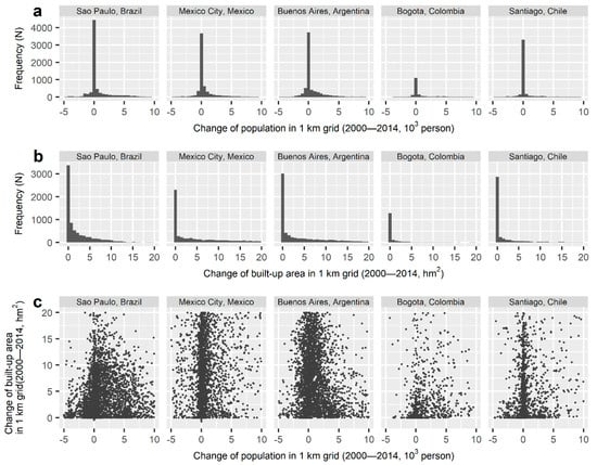 The frequency distributions of changes in population and built-up area from 2000 to 2014 in 1 km grid squares are shown in Figure 7a,b, and their correlations are presented in Figure 7c. Population and built-up areas remain unchanged in most grids during 2000–2014. The mean values of population change in the 1 km grid are 563 persons (São Paulo), 536 persons (Mexico City), 518 persons (Buenos Aires), 944 persons (Bogotá), and 200 person (Santiago). The mean values of changes in the built-up areas using the 1 km grid are 2.49 hm2 (São Paulo), 9.88 hm2 (Mexico City), 4.64 hm2 (Buenos Aires), 1.96 hm2 (Bogotá), and 3.15 hm2 (Santiago). From the mean values for each grid, Bogotá experiences the highest population increase but with the least expansion in use of urban land, verifying its high population density (Table 1 and Table 2) and compact urban form. Scatter plots show that the population change and the built-up area change are positively correlated (Figure 7c).