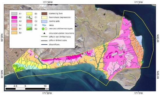 In total, 11 geomorphological types of surfaces were identified and mapped (Figure 3): A1—summit plains; A2 and A3—steep (>15°) and medium (5–15°) mountain slopes, respectively; A4—mountain foothills (<5°); B1—plains of glacial and water-glacial genesis; B2—the fourth terrace of the coastal plains of marine and glacial-marine genesis; B3—the third marine terrace; C1—upper elements of the hydrographic network (runoff troughs and dells), C2—ravines; D1—the first floodplain terrace of the Lorinka River; and D2—deltas and floodplains of small rivers. All the surfaces are differentiated by the lithological composition of the rocks.