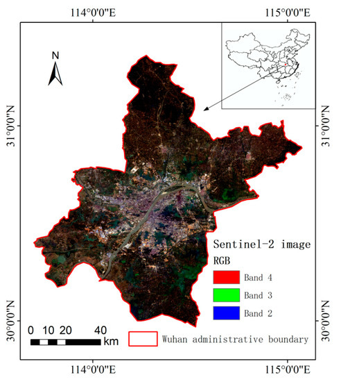Wuhan, the capital of central Hubei province, is located in central China. It is known as one of China’s “furnace cities” where summertime temperatures can soar to 40 °C. In the past several decades, Wuhan has experienced rapid urbanization, which would intensify the UHI effect. Additionally, the permanent resident population of Wuhan has reached 11.21 million. The increasingly serious urban heat island effect will affect the health of citizens. Therefore, Wuhan was selected as the study area (Figure 1).