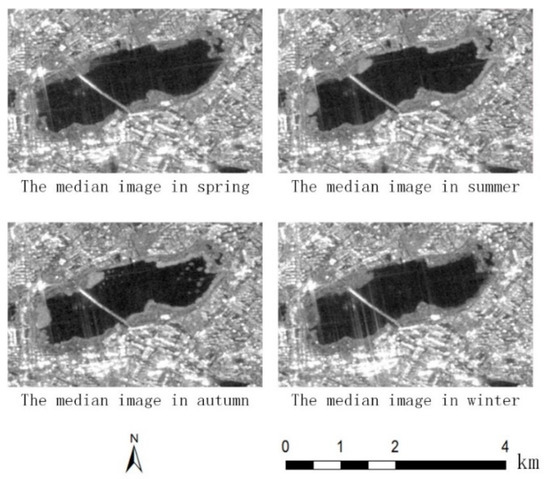 Data from the Sentinel-2 MSI are provided by the European Space Agency. The MSI sensors provide relatively fine spatial resolution multispectral imagery globally at a high revisit time (5 days at the Equator with two satellites in orbit). Data are acquired in 13 spectral bands in the optical NIR, SWIR parts of the electromagnetic spectrum. The data are acquired at a range of spatial resolutions: four bands at 10 m, six bands at 20 m, and three bands at 60 m. Only the bands that acquired data with a 10 m spatial resolution (i.e., B2, B3, B4, and B8) were used. In the GEE platform, the dataset “Sentinel-2 MSI: MultiSpectral Instrument, Level-1C” was selected for use in this study. Only images with less than 10% cloud coverage were selected, and the clouds were masked using the Fmask method [36]. One hundred thirty-six images met the less than 10% cloud coverage condition. As the median value image can generate the equally high accuracy as time-series images [37], this study also calculated the annual and seasonal median value images. Figure 2 shows the seasonal Sentinel-2 median images. It can be found that the vegetation distribution has some difference in a different season, and the quality of the median image is worst in winter. The median image was covered with thin clouds in winter because the weather in winter is often hazy in Wuhan.