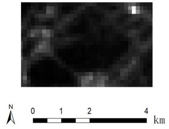 The NTL dataset represents the visible light emerging from the Earth at night, and this is strongly related to variables such as urban density. Here, NTL data acquired by the Luojia1-01 satellite system were used (Figure 5). This system was launched in June 2018 and had a spatial resolution of 130 m [43]. Only one image was used. This was acquired on 13 June 2018 after the visual check of images at the website http://59.175.109.173:8888/index.html accessed on 1 October 2019. Then the Luojia1-01 data were uploaded to the GEE platform. To aid the integration of the data with the Sentinel datasets, the Luojia1-01 data were resampled to 10 m using the bilinear interpolation method in the GEE platform.