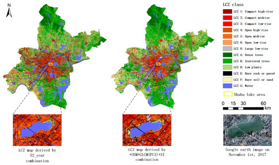 In total, 19 LCZ maps of Wuhan were generated by 19 dataset combinations. +OSM+GLCM(PC1)+SI and S2_year combinations have the highest and lowest OA accuracy, respectively. Figure 6 compares the two LCZ classifications generated by +OSM+GLCM(PC1)+SI and S2_year combinations. It was found that: (1) most of built type LCZ classes were located in the urban center of Wuhan; (2) LCZ A (i.e., dense tree) are mainly located in the northwest of Wuhan; (3) LCZ B (i.e., scatter tree) mainly distributed in the northwest and south-east of Wuhan; (4) LCZ G (i.e., water) could be depicted accurately in LCZ classification as water is more separable from other LCZ classes. (5) To compare two LCZ maps in detail, we selected the Shahu Lake area to zoom in on these two maps and compare them based on the corresponding google earth image. LCZ E (i.e., paved) and LCZ G (i.e., water) on the +OSM+GLCM(PC1)+SI map were more accurate than that on the S2_year map. Built type LCZ classes were overestimated on the S2_year map to some degree. Even LCZ G (i.e., water) was classified as LCZ 4 (i.e., open high-rise) or LCZ 5 (i.e., open midrise). In contrast, built type LCZ classes on +OSM+GLCM(PC1)+SI map are more consistent with google earth image. That proved again that the +OSM+GLCM(PC1)+SI combination could generate a more accurate LCZ map.
