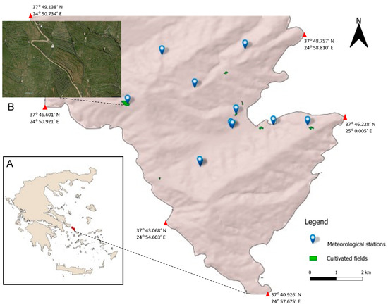 Map of the study area in Andros Island. The geographic location of Andros island is depicted (in red) on the map of Greece (A). The metereological stations and intervention sites are depicted by blue and green signs, respectively. A terraced site is also shown (B). The map was developed using the QGIS ver.3.10.6 open source GIS software and the 3D digital elevation model EUDEM ver.1.1 from the European Copernicus project. Coast line coordinates are indicated by red triangles. Map scale 1:1,000,000.