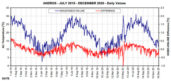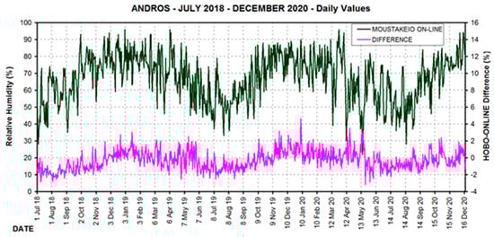 In order to compare the readings for temperature and relative humidity between the two types of stations, the MOUSTAKEIO site has been selected where both types of stations operate. Thus, Figure 2 represents mean daily values of air temperature from the Moustakeio central station and the difference from HOBO sensor’s measurements for the available period: 1 July 2018 to 17 December 2020. Differences in temperature generally do not exceed ±0.5 °C. For the same period, RH measurements were also analysed for both stations at Moustakeio, and the plot is given in Figure 3. Differences in humidity between the two types of stations generally do not exceed ±2%.