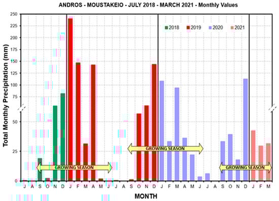 Total precipitation (mm) per month for three cultivating periods (2018–2021) in Andros Island.