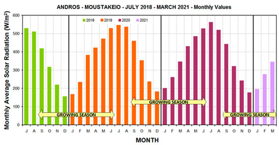 Average solar radiation (W/m2) per month for three cultivating periods (2018–2021) in Andros Island.