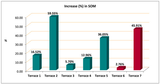 Increase in soil organic matter (SOM) content (%) in selected terraced fields after crop cultivation. Terraces 1–5 were cultivated with barley (Hordeum vulgare), while 6 and 7 with vetch (Lathyrus sp.).