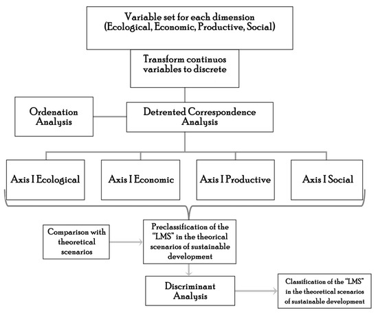 The data of the new variables (the coordinates of the different LMSs in the first axis of the DCA) for each of the analyzed dimensions of development were subject to a reassignment of values to facilitate their integration into the models that represent different development scenarios [29]. The new values varied between 0 and 100, so that the lowest coordinate value (including negative values) corresponded to 0, and the highest to 100. In this way, a gradient was established from low to high values in the ordination of LMSs for each of the evaluative dimensions. The results of the reallocation allowed a comparable approach (between 0 and 100) for the different dimensions. To support the consistency of the model, the independent nature of the dimensions considered was analyzed by means of a correlation between the first axes of the respective DCA. A summary scheme of the procedure can be seen in Figure 2.