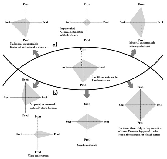 A key feature of the evaluation model is to consider the production system as a separate dimension. The concept of production includes technology, management, and planning, and ultimately informs us about how resources are obtained and managed, beyond their economic value. Sustainability is not a feasible objective if one starts from the dominant economic development models [55]. It is necessary to promote new approaches to resource management, the role of the market, and institutional policies, which consider the relevance of how these activities are carried out; in short, the production and governance systems.
