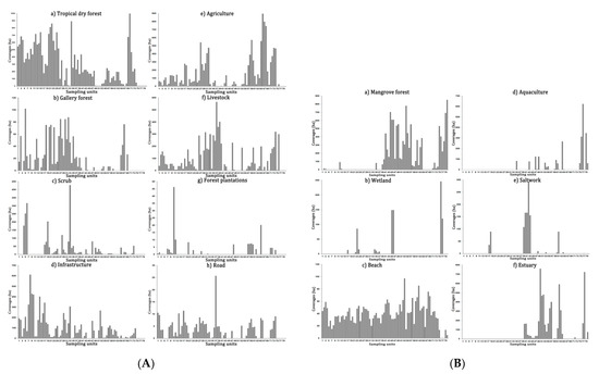 Distribution and relative coverage of the land-use types identified on the Pacific coast of Nicaragua: (A) Terrestrial zone land uses; (B) Marine-transition zone land uses. Numbering of the sampling units is from south to north of the Pacific coastline.