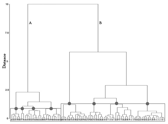 Classification of the 80 sampling units (SUs) into eight land-use units contained in two main groups: (A) Includes SUs related to the marine–coastal environment; (B) includes SUs located in terrestrial environments.