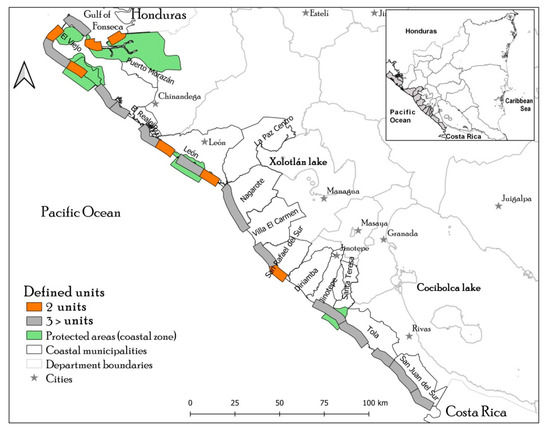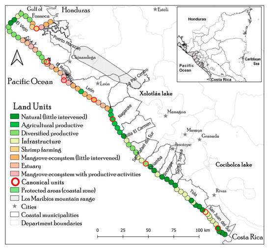 Distribution of the different land-use units along the Pacific coastline of Nicaragua, with indication of their canonical units.