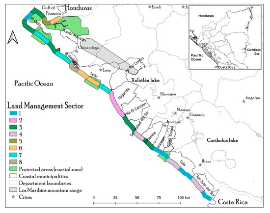 The study area corresponds to the coastal line of the Pacific of Nicaragua (450 km), administratively divided into five departments and 12 municipalities. It is part of the Pacific Coastal Plain, delimited by the Los Maribios volcanic mountain range (Figure 1).