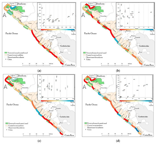 The Pacific coastal zone of Nicaragua presents a high diversity of land uses covering both terrestrial and marine-transition ecosystems. Tropical Dry Forest is present throughout the entire coastal zone (29.3% coverage in the entire area), with the highest coverage in the southern sector (with more than 40.4% for each sampling unit) (Figure 4(Aa)) and important extensions in the north (the Cosigüina Volcano protected area). Gallery Forest represents 2% of the total sampled area and is mainly distributed in the south (Figure 4(Ab)). The Scrub land-use class covers 3.3% of the total area and is located in the central part of the coastline (Figure 4(Ac)). The largest Infrastructures area is located in the South and is tourist-oriented (the municipality of San Juan del Sur; Figure 4(Ad)); therefore, it appears linked to the highest density of roads in this area. The Infrastructures in the coastal zone are mainly associated with urbanized areas. The highest coverage of housing and industry is located in the southern zone due to the touristic activity. On the other hand, in the north there is a restriction of infrastructures due to the greater presence of protected areas, mangroves, and the scarcity of road accesses. The communities that occupy more than 10 ha of the coastal zone correspond to cities with more than 1000 inhabitants. San Juan del Sur and Corinto, the country’s main port, represent the highest population densities on the coast, with more than 15,000 inhabitants.