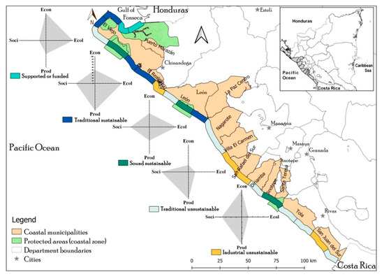 An important amount of the social, economic, and productive data was obtained through surveys directed to the leaders of 30 communities located on the Pacific coastline of Nicaragua. Surveys were carried out from October to December 2013. Other relevant information came from the National Fisheries survey [30], which includes data on vessels, total catches, and number of fishermen, among others. The information for the maritime ports came from the official Report of the Nicaraguan State for 2013 [31]. Finally, the data on the ecological variables were obtained from the analysis of land uses in each of the 80 sampling units. A matrix was elaborated with this set of variables according to their role for the evaluation of the four dimensions considered, where a variable may be involved in the evaluation of more than one dimension.