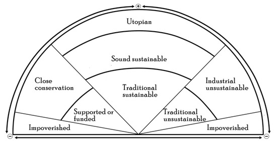 Considering the traditional sustainable scenario as a starting reference, it is possible to move to a sound sustainable scenario, with relevant ecological and social values, or to others in which the degradation of ecosystems and their services predominate. Another possible option would be to move toward close conservation of nature, which also reduces the flow of ecosystem services to humans. This figure shows a dynamic vision of the possible options [52]. Drivers of change can come from public policies or from natural or social events. The desirable goal is to combine social progress and the prudent use of natural resources with the economic system oriented by social and ecological objectives, in such a way that they can ensure favorable living conditions for current and future generations, reaching the so-called sound sustainable scenario.