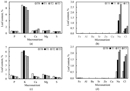 - Lao, M.T.; Plaza, B.M.; Jiménez, S. Impact of salt stress on micronutrients in Cordyline fruticosa var. ‘Red Edge’. J. Plant Nutr. 2013, 36, 990–1000. [Google Scholar] [CrossRef]