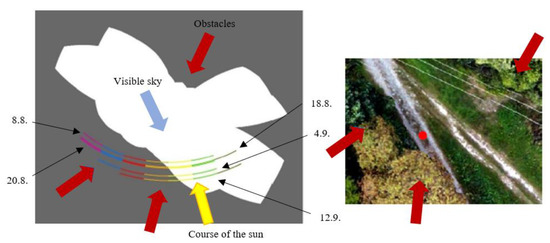 Figure 4 shows also the individual semicircles of the sun’s course across the sky on all five days that the site was measured. From above, these were 8 August, 18 August, 20 August, 4 September and 12 September 2019. This scheme is the same for the images of all measured locations. For example, on the third day of measurements, 20 August 2019, measurements began at 11 a.m. (light green), then are shown as yellow at 12 noon, orange at 1 p.m., red at 2 p.m., blue at 3 p.m. and pink at 4 p.m. It can be seen from the figure that, during the first measurement, there is a point in the sun (white colour) and from the yellow colour—i.e., from 12 noon—the point is in the grey field, so it is shaded.
