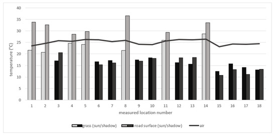 Surface temperatures were measured on 8 August, 18 August, 20 August, 4 September and 12 September 2019 using a Bosch PTD 1 hand-held non-contact thermometer. This thermometer does not allow direct adjustment for the emissivity of the measured surface; however, it is possible to choose temperature measurement with a low, medium or high emissivity. All types of selected surface had high emissivity in the range 0.9 to 0.95 and therefore the high emissivity setting was chosen for all measurements at all locations. The surface temperature was measured at intervals of one hour and proceeded from point No. 1 to point No. 18. The surface temperature, air temperature and vegetation surface temperature were measured. The vegetation surface temperature was measured 1 m from the edge of the road on permanent grassland. The measurements always started on the hour at point No. 1 and the last point No. 18 was measured about 30 min later. This time delay was due to the area over which the measured locations were distributed.