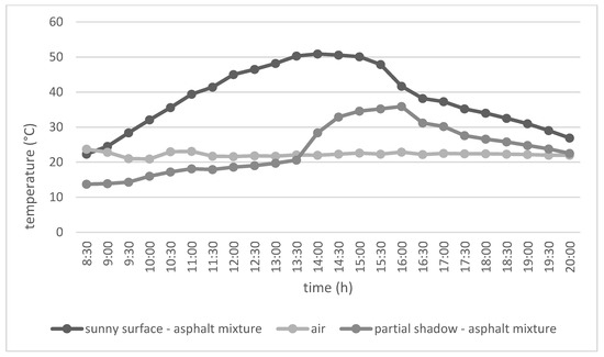 When comparing the temperature of measured locations and grass in Figure 7, it is evident that the grass surface under the same meteorological conditions did not reach such high temperatures, even in direct sunlight as the surface with reinforcement (reinforced surfaces are all measured surfaces except the ground plan). Compared to paved surfaces, there were smaller fluctuations in surface temperature relative to the air temperature on the vegetation cover. The asphalt mixture could accumulate more heat in a shorter time. Compared to the surface with vegetation cover or gravel abrasive layer of crushed aggregate 8/16 mm, which is operationally strengthened (see Figure 8), the asphalt mixture had a faster increase in temperature during the same sun exposure period. It is thus clear that the asphalt mixture has the ability to rapidly accumulate heat, i.e., a sharp rise in temperature, but then its cooling is much slower, in which case twice as long is needed.