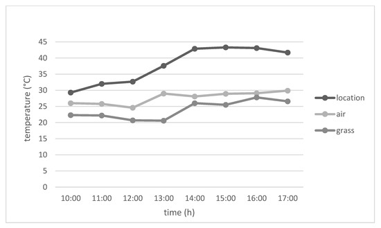Temperature comparison of all measured locations and grass locations with the air temperature at 12 noon on 18 August 2019 (light green/grey—sunlight, dark green/grey—shadow).