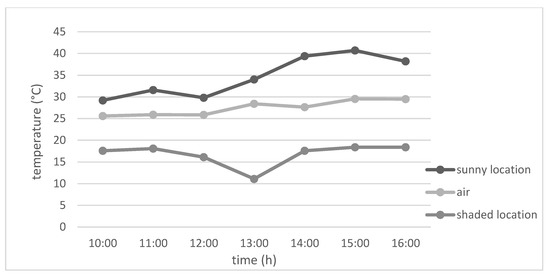 Surfaces that are affected by sunlight (marked in light green/grey in Figure 5) have a higher temperature than those in the shade (marked in dark). Temperature also depends on the type of surface and the location on the sunlit asphalt mixture. The sunlit crumbling abrasive layer of the asphalt mixture and the sunlit earth plain have the highest temperatures, up to 37 °C, at an air temperature of around 25 °C (see Figure 6, Figure 7 and Figure 8). The heat map (Figure 9) was made for an overview of the temperature conditions in the area but was not used for analysis. In contrast, point No. 3 on the asphalt mixture, which was in the shade, reached a temperature of only 20 °C at the same air temperature. The asphalt surface, therefore, has a much higher heat storage capacity than other surfaces and can heat up to temperatures 15 °C higher than the air temperature.