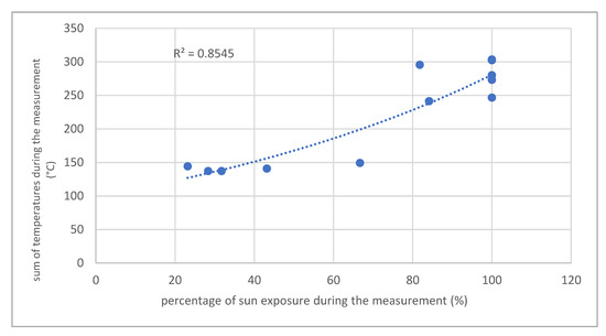 In addition to the dependence of temperature on different types of surface, the dependence of temperature and sun exposure time regardless of the type of surface was solved. This dependence was found only for locations 1–14 because locations 15–18 were not measured during the shooting and thus an accurate digital model of the surface was not created. Figure 10 shows the dependence of the sum of surface temperatures during the measurement period on the percentage of sun exposure during the measurement period on individual days. On most of the monitored days, a significant dependence was found between the sum of surface temperatures during the measurement period and the percentage of sun exposure during this time. On almost all days, an exponential dependence was found between the sum of the surface temperatures during the measurements and the incident sunlight with R2 greater than 0.8. Only on 8 August 2019 was the dependence lower (R2 = 0.66), which could probably be due to clouds during the day. The multiple dependence of the surface temperature on the sum of incident solar radiation and the sum of air temperatures for the previous five hours was also monitored. In multiple regression analysis of all days and all measurement times, the value R2 = 0.76 was reached and thus a significant dependence of the surface temperature on both the incident solar radiation and the air temperature was demonstrated. Estimates of the regression equation parameters are in Table 2. The greater dependence on sun exposure and less on air temperature is also shown in Figure 11.